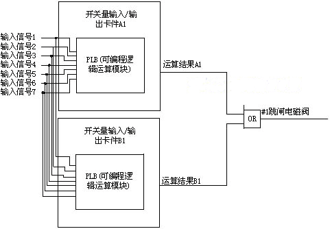 由上圖可知,多個輸入信號在開關(guān)量輸入/輸出卡件中,由PLB(可編程邏輯運(yùn)算模塊)運(yùn)算后輸出運(yùn)算結(jié)果,送至下一個開關(guān)量輸入/輸出卡件,與其他輸入信號再通過PLB模塊進(jìn)行運(yùn)算,從而避免采用總線通訊的連接方式。當(dāng)系統(tǒng)通訊總線故障時,各輸入信號仍可以在開關(guān)量輸入/輸出卡件中進(jìn)行運(yùn)算并最終驅(qū)動跳閘繼電器,因此,不會發(fā)生保護(hù)拒動的現(xiàn)象。