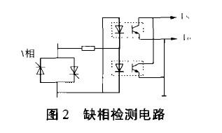 啟動時(接到啟動指令),從單片機輸出口產(chǎn)生移相觸發(fā)脈沖,通過控制串接在三相異步電動機繞組中的雙向晶閘管的導(dǎo)通角α,使之實現(xiàn)斜坡方式減壓啟動。在電機運行中,實時檢測電機功率因數(shù),據(jù)此改變導(dǎo)通角α,實現(xiàn)節(jié)電運行。過流與過載檢測采用常規(guī)電流互感器電路,經(jīng)整流、濾波、放大、A/D轉(zhuǎn)換及隔離后送人單片機,由軟件完成數(shù)據(jù)處理及判斷。缺相檢測采用同時檢測三相電源的方法以判斷缺相故障。每相檢測電路如圖2所示。在晶閘管導(dǎo)通期間,該電路Vo應(yīng)輸出高電平信號,否則該相缺相(電流為零)。各相的檢測信號也送入單片機進行處理及判斷。