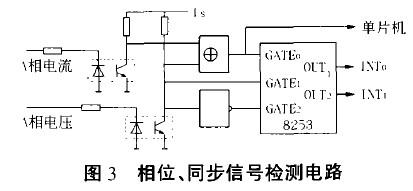 相位檢測與同步信號產(chǎn)生電路見圖3。A相電流、電壓信號經(jīng)光耦變?yōu)榉讲ê笏腿氘惢蜷T,定時/計數(shù)器8253的通道0(工作于方式2)用于檢測A相電壓與電流的相位差,電壓過零時門控端GATE0得到高電平,開始計數(shù),電流過零時GATEo變?yōu)榈碗娖?,計?shù)停止。單片機在GATE。低電平期間讀出計數(shù)值則可得到電壓電流相位差。由8253的通道l、2(工作于方式5)延時實現(xiàn)觸發(fā)脈沖的移相控制,A相電壓過零為同步信號啟動定時。通道l與單片機的定時/計數(shù)器T0配合控制l、2、3號晶閘管的導(dǎo)通時刻,通道2與單片機的定時/計數(shù)器T,配合控制4、5、6號晶閘管的導(dǎo)通時刻,T0、T1定時時間均為3.3ms,它是利用前一次定時中斷啟動下一次定時,而在一周期內(nèi)分別產(chǎn)生相差3.3ms的三個觸發(fā)控制脈沖。