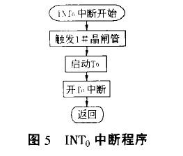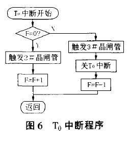 的硬件電路的配合,使得主程序在每次循環(huán)中都能進行故障檢測、電流值采樣顯示、功率因數(shù)角測量、觸發(fā)脈沖移相和輸出控制,因此做到了控制迅速,采樣、故障診斷兩不誤。INTo與To中斷程序?qū)崿F(xiàn)的是1、2、3號晶閘管的觸發(fā)脈沖移相與定位控制,其流程圖見圖5、圖6。INT1與T1中斷程序?qū)崿F(xiàn)的是4、5、6號晶閘管的觸發(fā)脈沖移相與定位控制,其流程圖與圖5、圖6相似。
