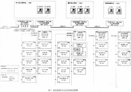 板坯連鑄機(jī)自動(dòng)化控制系統(tǒng)包括公共部分、鑄流部分、儀表部分、切割機(jī)、去毛刺機(jī)及結(jié)晶器液面( 有些高端的包含結(jié)晶器自動(dòng)調(diào)寬、液壓振動(dòng)、下渣檢測(cè)、漏鋼預(yù)報(bào)、輕壓下等控制系統(tǒng)) 控制共六個(gè)子系統(tǒng)。前3 個(gè)子系統(tǒng)用一個(gè)西門子SIMATIC400 站進(jìn)行控制, 切割機(jī)用SIMATIC300 站進(jìn)行控制, 去毛刺機(jī)用SIMATIC200 站進(jìn)行控制; 結(jié)晶器液面采用工控機(jī)控制( 配網(wǎng)卡) 。這六個(gè)站通過(guò)西門子通訊模塊CP443 和CP343 掛在一個(gè)工業(yè)以太網(wǎng)- SIMATICH1 網(wǎng)上。同時(shí)還有五套工業(yè)微機(jī)通過(guò)西門子網(wǎng)卡CP1613 也掛在同一個(gè)SIMATIC H1 網(wǎng)上, 作為人機(jī)界面完成板坯連鑄自動(dòng)化控制系統(tǒng)的監(jiān)視和控制。二級(jí)管理系統(tǒng)包括一套服務(wù)器和一套工業(yè)微機(jī), 主要完成對(duì)板坯連鑄系統(tǒng)的管理任務(wù), 及時(shí)下達(dá)連鑄工作的計(jì)劃和命令。