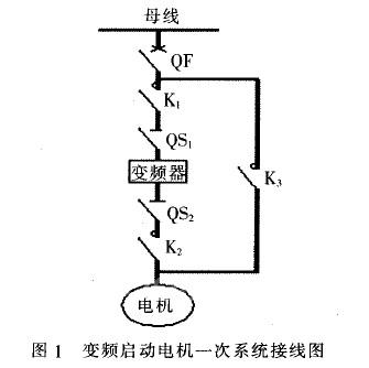 在變頻運(yùn)行時(shí),手動(dòng)合隔離開關(guān)OS1、OS2,此時(shí)高壓變頻器輸出開關(guān)接點(diǎn)允許用斷路器QF合閘。QF合閘后,在DCS(或PLC)上可啟動(dòng)高壓變頻器,高壓變頻裝置自動(dòng)合K1、K2真空接觸器。