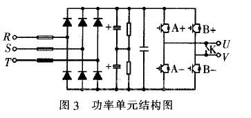 ?。?)系統(tǒng)結(jié)構(gòu):高壓變頻調(diào)速系統(tǒng)的結(jié)構(gòu)見圖2,由移相變壓器、功率單元和控制器組成。如:10 kV系列有24個(gè)功率單元.每8個(gè)功率單元串聯(lián)構(gòu)成一相。每個(gè)功率單元結(jié)構(gòu)上完全一致,可以互換。其電路結(jié)構(gòu)見圖3,其為基本的交一直一交單相逆變電路.整流側(cè)為二極管三相全橋.通過對(duì)IGBT逆變橋進(jìn)行正弦PWM控制。