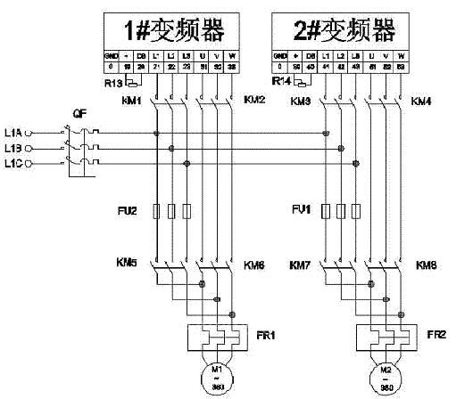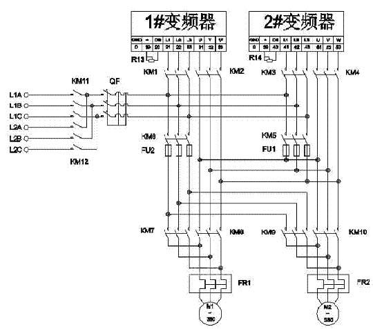 2、1#變頻器只能帶1#電動(dòng)機(jī),2#變頻器只能帶2#電動(dòng)機(jī),無(wú)法實(shí)現(xiàn)1#變頻器帶2#電動(dòng)機(jī)、2#變頻器帶1#電動(dòng)機(jī)工作方式,工作模式單一,靈活性較差,變頻器利用率較低;