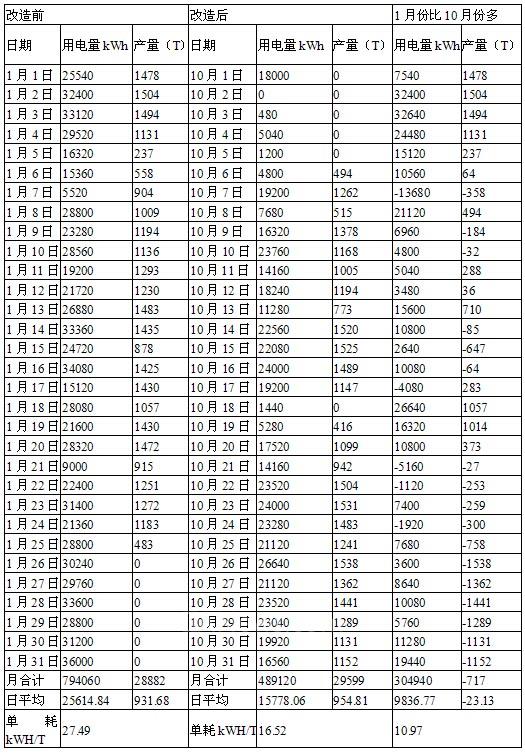 從上表可以看出,改造前的1月份與改造后的10月份,其單月產(chǎn)量差不多(10月份比1月份多產(chǎn)熟量717T),停窯時(shí)間都是6天,但1月份的用電量為794060kWH,10月份的用電量為489120kWH,1月份比10月份多用電304940kWH;1月份日平均用電量為25614kWH,10月份日平均用電量為15778kWH,1月份日平均用電量比10月份多9836kWH;1月份(高溫風(fēng)機(jī))平均單位熟料電耗為27.49kWH/T,10月份為16.52kWH/T,1月份(高溫風(fēng)機(jī))平均單耗比10月份多10.97 kWH/T。
