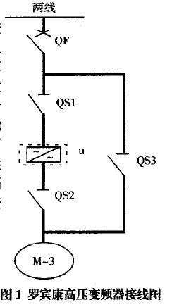 系統(tǒng)旁路開關(guān)柜為一拖一手動旁路系統(tǒng)f用于變頻,工頻切換)原理是由3個高壓隔離開關(guān)QS1,QS2和QS3組成,見圖1。要求QS2和QS3不能同時閉合,在機(jī)械上實現(xiàn)互鎖。變頻運(yùn)行時,QS1和QS2閉合,QS3斷開;工頻運(yùn)行時,QS3閉合,QS1和QS2斷開。為了實現(xiàn)變頻器故障的保護(hù),變頻器對用戶開關(guān)QF進(jìn)行連鎖,一旦變頻器故障,變頻器跳開Qr",要求用戶對QF的合分閘電路進(jìn)行適當(dāng)改造。工頻旁路時,變頻器應(yīng)允許QF合閘,撤消對QF的跳閘信號,使電機(jī)能正常通過QF合閘工頻啟動。QF:廠方高壓真空斷路器f為變頻器提供6KV高壓電)QS1,QS2,QS3:手動隔離刀閘BPQ:HARSVERT—A06/085變頻器M:630KW/6KV異步電動機(jī)。