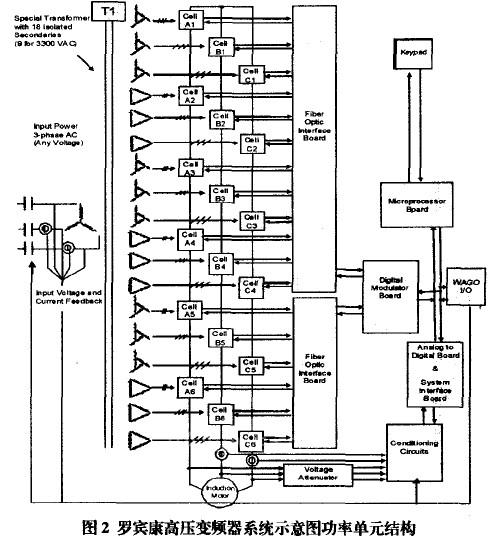 無諧波高壓變頻采用若干個低壓PWM變頻功率單元串聯(lián)的方式實現(xiàn)直接高壓輸出。該變頻器具有對電網(wǎng)諧波污染極小,輸入功率因數(shù)高,輸出波形質(zhì)量好,不存在諧波引起的電機(jī)附加發(fā)熱、轉(zhuǎn)矩脈動、噪音、dr/dr及共模電壓等問題的特性,不必加輸出濾波器,就可以使用普通的異步電機(jī),包括國產(chǎn)電機(jī)。高壓變頻器的系統(tǒng)圖如下: