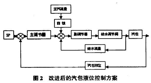 通過分析發(fā)現(xiàn),調(diào)節(jié)器的輸人為:汽包液位設(shè)定值-汽包液位測(cè)量值+主蒸汽流量-給水流量。實(shí)際運(yùn)行中由于各種擾動(dòng)的影響。給水流域和主蒸汽流量幾乎不可能相等。該方案的控制結(jié)果將使汽包液位產(chǎn)生靜差。為此,采用在三沖量基礎(chǔ)上的串級(jí)控制方案。如圖2所示。由于主調(diào)節(jié)器的作用。該方案較好地消除了靜差。