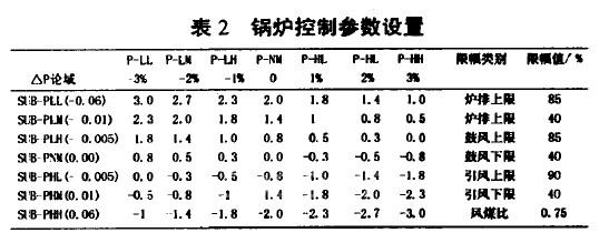 1.2.5 燃燒系統(tǒng)的控制 鍋爐參數(shù)中,主汽壓力(或過熱蒸汽壓力)是衡量蒸汽量與外界負(fù)荷兩者是否適應(yīng)的指標(biāo)。引起主汽壓力變動(dòng)的擾動(dòng)來源有兩個(gè):一是燃料量的擾動(dòng),為基本擾動(dòng);——是用汽量的擾動(dòng)。為負(fù)荷擾動(dòng)。基本擾動(dòng)可以通過自身的閉環(huán)來克服,負(fù)荷擾動(dòng)則不易做到。負(fù)荷變化時(shí)母管壓力出現(xiàn)瞬時(shí)改變,而調(diào)節(jié)通道的遲延較大,對象擾動(dòng)通道與調(diào)節(jié)通道的動(dòng)態(tài)甚為懸殊。調(diào)節(jié)很不利。根據(jù)司爐工經(jīng)驗(yàn),煤從進(jìn)入爐膛到完全燃燒需要20min以上。常規(guī)的P、I、D調(diào)節(jié)跟隨性較差,無法完成這樣一個(gè)大滯后系統(tǒng)的自動(dòng)調(diào)節(jié)。采用基于模糊理論的專家系統(tǒng)[l],可較好地實(shí)現(xiàn)對鍋爐燃燒系統(tǒng)的自動(dòng)控制。表2是基于專家系統(tǒng)的控制參數(shù)規(guī)則表。其中P論域表示模糊控制中鍋爐壓力的論域,AP論域表示兩個(gè)運(yùn)行周期鍋爐壓力變化差的論域。燃燒周期的自動(dòng)調(diào)整,加快了負(fù)荷大幅變化時(shí)燃燒控制的響應(yīng)速度。煤質(zhì)或爐況的不同對調(diào)節(jié)效果有一定的影響。由于隸屬度函數(shù)的曲線均相互交錯(cuò)重疊,岡此模糊控制算法對于參數(shù)變化的適應(yīng)性具有較強(qiáng)的魯棒性。實(shí)際運(yùn)行驗(yàn)證了這一特點(diǎn)。 1.2.6 閥門的調(diào)節(jié)與限幅 規(guī)則表參數(shù)中閥門變化值對應(yīng)于每個(gè)燃燒周期爐排轉(zhuǎn)速的變化鰱。爐排轉(zhuǎn)速控制給煤量,是保證鍋爐經(jīng)濟(jì)、安全運(yùn)行的重要控制對象。根據(jù)操作工的經(jīng)驗(yàn),在一定的爐況和煤質(zhì)條件下.爐排轉(zhuǎn)速達(dá)到一定限額厲將不再對汽包壓力起決定作用。 此必須對爐排轉(zhuǎn)速設(shè)置合理的上限以防燃燒不充分。污染環(huán)境。鼓風(fēng)轉(zhuǎn)速與爐排轉(zhuǎn)速之問應(yīng)根據(jù)一定的風(fēng)煤比互相協(xié)調(diào),保證燃燒的經(jīng)濟(jì)性。這個(gè)比例與具體的煤質(zhì)、爐況、變頻器轉(zhuǎn)速相關(guān),在運(yùn)行中需根據(jù)現(xiàn)場情況及時(shí)調(diào)整。引風(fēng)轉(zhuǎn)速與鼓風(fēng)轉(zhuǎn)速應(yīng)互相適應(yīng),將爐膛負(fù)壓維持在一定范同內(nèi),保證燃燒的安全性。燃燒控制規(guī)則表以及鍋爐各利一參數(shù)的設(shè)置如表2所示。為方便操作,將爐排轉(zhuǎn)速、鼓風(fēng)轉(zhuǎn)速、引風(fēng)轉(zhuǎn)速限幅、燃燒周期等參數(shù)設(shè)置為操作員權(quán)限,井引至監(jiān)控界面以便司爐工在線修改。