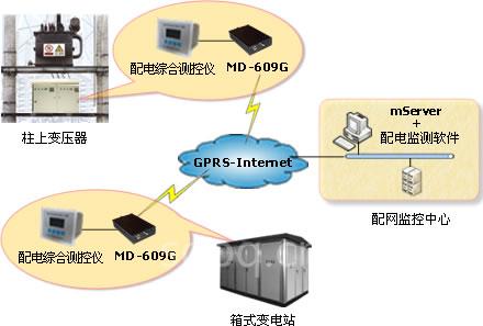 驛唐MD-609G GPRS DTU具有極高的性價(jià)比,并已通過(guò)電磁兼容相關(guān)實(shí)驗(yàn),能很好的應(yīng)用在電磁環(huán)境復(fù)雜的電力應(yīng)用上,并成功應(yīng)用于中低壓配電及無(wú)功補(bǔ)償?shù)葢?yīng)用上,MD-609G具有標(biāo)準(zhǔn)RS-485/RS-232接口,可直接連接配電管理終端或配電綜合測(cè)控儀,實(shí)現(xiàn)設(shè)備數(shù)據(jù)的無(wú)線傳輸,形成完整的無(wú)線配網(wǎng)監(jiān)控系統(tǒng)。系統(tǒng)結(jié)構(gòu)圖如下: