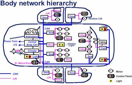 通過上圖可以看到,藍色較粗線代表CAN總線,它連接了傳動裝置控制單元、燈控單元、門控單元、座椅控制單元以及儀表盤控制單元等等。紅色較細線代表LIN總線,由LIN總線構(gòu)成的LIN網(wǎng)絡(luò)作為CAN網(wǎng)絡(luò)的輔助網(wǎng)絡(luò),連接了車窗控制單元、雨刷控制單元、天窗控制單元等低速設(shè)備。