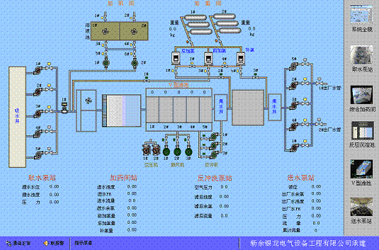 ·監(jiān)測整個生產(chǎn)工藝流程和各細(xì)部的動態(tài)模擬圖形。該系統(tǒng)實現(xiàn)了水廠整體工藝流程、各主要工藝設(shè)備運行狀態(tài)、過程控制及各生產(chǎn)環(huán)節(jié)生產(chǎn)數(shù)據(jù)的實時采集與現(xiàn)實。主要流程畫面有:取水泵房流程圖、加礬間流程圖、加氯間流程、反應(yīng)沉淀池流程、V型濾池流程、公共沖洗泵房流程、送水泵房流程、10kV一次系統(tǒng)、低壓系統(tǒng)等畫面。實現(xiàn)的工藝生產(chǎn)設(shè)備監(jiān)控功能有:所有被監(jiān)控設(shè)備的運行狀態(tài)、啟??刂啤⒃O(shè)備與設(shè)備之間的連鎖控制、工藝參數(shù)的設(shè)定,以及設(shè)備溫度、電流、壓力、液位、流量等參數(shù)的顯示、報警、記錄、趨勢及累積量計算等。