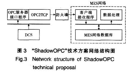 傳統(tǒng)OPC是個(gè)通用的標(biāo)準(zhǔn)接13,適用于各類應(yīng)用環(huán)境.故采用OPC連接技術(shù)作為DCS和MES連接的數(shù)據(jù)接口。由于OPC服務(wù)器具有對(duì)DCS實(shí)時(shí)數(shù)據(jù)“讀”與“寫”的雙向通訊功能,MES網(wǎng)絡(luò)通過OPC服務(wù)器向DCS控制站“寫”數(shù)據(jù)在一定程度上將損害DCS作為控制系統(tǒng)要求相對(duì)封閉的安全性要求,為現(xiàn)場(chǎng)生產(chǎn)監(jiān)控留下安全隱患。而MES網(wǎng)絡(luò)數(shù)據(jù)的實(shí)時(shí)性和安全性與DCS網(wǎng)絡(luò)相比要求相應(yīng)要低,不希望將DCS實(shí)時(shí)數(shù)據(jù)傳輸?shù)組ES的同時(shí)而降低了DCS的安全性。故最終采用了浙大中控成熟的系統(tǒng)集成解決方案中的“ShadowOPC”軟件技術(shù)。此技術(shù)實(shí)現(xiàn)方法為:在OPC服務(wù)器端增加了一個(gè)“OPC2TCP”的數(shù)據(jù)接口.DCS的實(shí)時(shí)與歷史數(shù)據(jù)向上發(fā)送至OPC服務(wù)器后不立即發(fā)布到MES網(wǎng)絡(luò)中,而是通過“OPC2TCP”后再轉(zhuǎn)發(fā)至MES網(wǎng)絡(luò)。MES網(wǎng)絡(luò)中的數(shù)據(jù)則不能通過該數(shù)據(jù)接口影響DCS。由于“OPC2TCP”數(shù)據(jù)接13的存在,實(shí)際上使得DCS與MES網(wǎng)絡(luò)間的數(shù)據(jù)傳輸成為單向,即“DC.S—MES”。如此大大提高了DCS實(shí)時(shí)數(shù)據(jù)的安全性。該技術(shù)方案的網(wǎng)絡(luò)結(jié)構(gòu)如圖3所示。