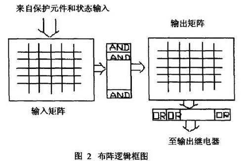 以上所有發(fā)電機(jī)組用的保護(hù)功能都是組合在一個(gè)布陣邏輯陣列中,該布陣邏輯監(jiān)視保護(hù)功能和邏輯輸入的狀態(tài), 并通過邏輯功能控制繼電器輸出。布陣邏輯是以軟件為基礎(chǔ),所以能用最少的成本和布線綜合入繼電器中,并通過修改繼電器的設(shè)定值使其易于重新配置。為了適合不同發(fā)電機(jī)的運(yùn)用,布陣邏輯是可變和可配置的,同時(shí)還允許某些閉鎖和互鎖邏輯的應(yīng)用。LGPG111布陣邏輯具有可編程邏輯陣列的設(shè)備中平常能找到的結(jié)構(gòu),如圖2所示。圖中示出了其內(nèi)部AND-OR(與一或)結(jié)構(gòu)。當(dāng)AND函數(shù)為2個(gè)或多個(gè)輸入或恰好通過1個(gè)輸入連接提供閉鎖和互鎖時(shí),0R函數(shù)允許1個(gè)或多個(gè)AND函數(shù)輸出, 以控制各個(gè)輸出繼電器。輸入和輸出矩陣允許建立所需的連接,該矩陣的每個(gè)交叉代表可編程的相互連接。只要計(jì)及相應(yīng)的相互連接及向繼電器輸入信息,通過該布陣邏輯的設(shè)定,就可以配置所需的跳閘邏輯。