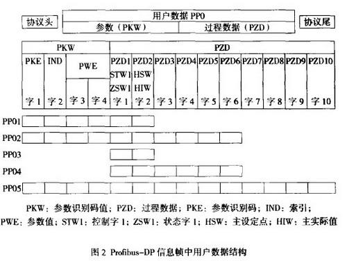 在變頻器現(xiàn)場(chǎng)總線(xiàn)控制系統(tǒng)中,Profibus—DP的通訊協(xié)議的信息幀分為協(xié)議頭、用戶(hù)數(shù)據(jù)和協(xié)議尾,用戶(hù)數(shù)據(jù)結(jié)構(gòu)被指定為參數(shù)過(guò)程數(shù)據(jù)對(duì)象(PPO),有的用戶(hù)數(shù)據(jù)帶有一參數(shù)區(qū)域和一過(guò)程數(shù)據(jù)區(qū)域,而有的用戶(hù)數(shù)據(jù)僅由過(guò)程數(shù)據(jù)組成。變頻傳動(dòng)概要定義了五種PPO類(lèi)型,如圖2所示。