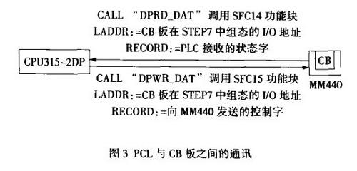 采用SIMATIC S7—300系列的CPU315—2DP作為DP主站,CPU3 15—2DP系統(tǒng)本身具有Profibus—DP接口,無(wú)需另外的通訊接口單元。在編程軟件STEP7中完成硬件網(wǎng)絡(luò)組態(tài),為變頻器分配網(wǎng)絡(luò)地址,該地址必須與變頻器CB板中設(shè)置的相同,在組織塊OB中選用SFC14“DPRD—DAT”、SFC15 “DPWR— DAT” 系統(tǒng)功能塊向變頻器的CB模塊接收/發(fā)送過(guò)程數(shù)據(jù),如圖3所示。要注意的是MICROMASTER 4系列變頻器與以前的MICROMASTER 3系列變頻器的控制字是不同的。