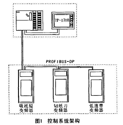 該切紙機的控制系統(tǒng)主要由西門子公司S7—300控制器,西門子公司的,人鼙變頻器、運動變頻器,以及西門子公司的TP-170B觸摸屏利Profibus—DP網(wǎng)絡(luò)組成。示意圖如下:
