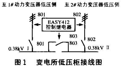 如圖1,變電所低壓柜采用單母線分段結(jié)構(gòu),設(shè)備正常運行時,2路進線開關(guān)801、802在合位,母聯(lián)開關(guān)803在分位,當斷開動力變壓器高壓側(cè)開關(guān)或動力變壓器高壓側(cè)開關(guān)跳閘時,要求對應(yīng)的進線開關(guān)自動分開,母聯(lián)開關(guān)自動合上。根據(jù)上述要求,由于設(shè)備附近無直流電源,因此選用的EASY型號是EASY4l2一AC—R.電源為230VAC,有8個數(shù)字量輸入端,分別是I1~I8,4個繼電器輸出端為Q1~Q4,能夠滿足實際需要。