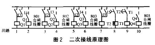 ?。?)當主開關(guān)801或802開關(guān)在分位及主開關(guān)801和802開關(guān)都在分位,此時輸入EASY輸入端I2、I4分別取801、802開關(guān)常閉接點,圖2中回路5輸出繼電器Q2線圈受電,使回路6中803合閘回路的一個斷開點接通。