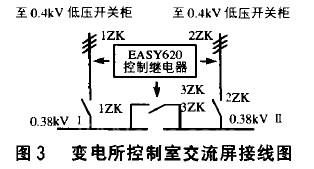 變電所控制室交流屏也采用單母線分段運行,如圖3。正常運行時,2路進線開關(guān)lZK、2ZK在合位,母聯(lián)開關(guān)3ZK在分位,當任何一段進線電壓失壓(小于180v)時,要求進線開關(guān)自動分開,母聯(lián)開關(guān)自動合上,當進線電壓恢復(fù)正常時,母聯(lián)開關(guān)自動分開,進線開關(guān)自動合上。根據(jù)上述要求,由于設(shè)備附近有直流電源,并且需要EASY有模擬量輸入功能,這里選用的EASY型號是EASY620一DC—TC。電源為24VDC,有12個數(shù)字量輸入端,分別是I1~I12,其中有2個可用于模擬量。8個輸出端,分別是Q1—Q8,Q1—Q6控制1~3ZK分合閘;Q7、Q8控制1ZK、2ZK脫扣告警:I1~I3為空氣開關(guān)1ZK~3zK輔助觸點;I5、I6為1ZK、2ZK脫扣報警觸點;I7、I8為1、2#交流模擬量。