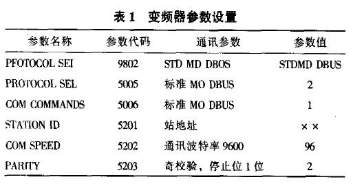 在通信接15與變頻器進行通信時,通信接15的參數(shù)應(yīng)與變頻器的參數(shù)設(shè)置相對應(yīng)。主要設(shè)置的參數(shù)有站地址、通信速率、校驗等,變頻器的參數(shù)設(shè)置見表1。