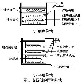 變壓器的結(jié)構(gòu)設(shè)計(jì)和繞組分配。如圖5,變壓器有兩種常見的繞法:順序繞法和夾層繞法。順序繞法一般漏感為原邊電感量的5%左右,但由于初,次級(jí)只有一個(gè)接觸面,原副邊間雜散電容較小。夾層繞法一般漏感為原邊電感量的1-3%左右,但由于初,次級(jí)有兩個(gè)接觸面,原副邊間雜散電容較大。漏感是產(chǎn)生干擾的重要因素,原副邊間雜散電容是干擾的傳播通道,為抑制干擾,既要減小漏感又要減小原副邊間雜散電容。因此,設(shè)計(jì)時(shí)應(yīng)綜合考慮這兩個(gè)方面進(jìn)行設(shè)計(jì),具體采用何種繞法應(yīng)該根據(jù)實(shí)際情況而定。