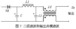 為了增加對(duì)干擾的濾波效果,可以在電源的二次輸出側(cè)加入二級(jí)濾波和一個(gè)共模電感。如圖7所示,L1,C1組成二級(jí)濾波電路,濾除差模干擾;L2是輸出共模電感,濾除輸出電壓中所含有的共模干擾。