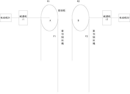 (1)正常工作模式(即雙機(jī)拖動),不使用機(jī)械差速器,每個電機(jī)拖動一個驅(qū)動輪,兩電機(jī)之間無剛性連接,而是由鋼絲繩和膠帶構(gòu)成彈性聯(lián)接,兩電機(jī)的調(diào)速回路各自獨立。