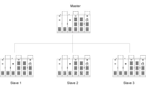 變頻器在多機(jī)隨動的情況下,需要有此功能,此功能的實現(xiàn)方式是,把高壓變頻器的控制器通過高速通訊網(wǎng)絡(luò)組網(wǎng),參數(shù)設(shè)置里,把需要隨動的變頻器設(shè)定為從,把需要電控系統(tǒng)來控制的變頻器設(shè)置為主。主從控制網(wǎng)絡(luò)示意圖如圖4所示。主從控制方式中,可以控制同步啟停和功率平衡。