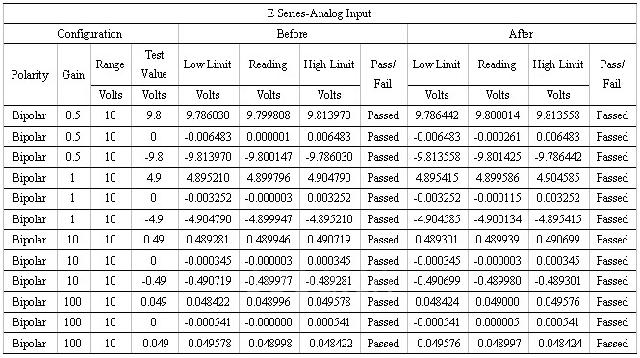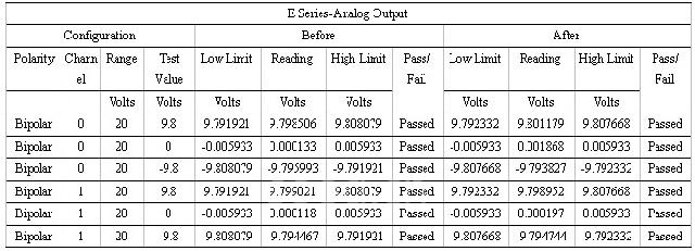 Before為調(diào)整之前的校準(zhǔn)結(jié)果,After為調(diào)整后的校準(zhǔn)結(jié)果。另外可以看出,NI公司所給出的Before的low limit和high limit 比起After的Low Limt 和High Limit略大,虛擬儀器卡的校準(zhǔn)過(guò)程中進(jìn)行了參數(shù)值的調(diào)整,這一點(diǎn)從Before值與After值之間有少許不同可以看出。