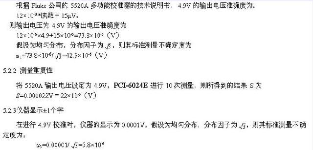 PCI-6024E校準(zhǔn)結(jié)果測(cè)量不確定度涉及到電壓參數(shù)和頻率參數(shù),本文僅對(duì)4.9V電壓測(cè)量不確定度進(jìn)行評(píng)定,評(píng)定所使用的標(biāo)準(zhǔn)儀器為5520A多功能校準(zhǔn)器。