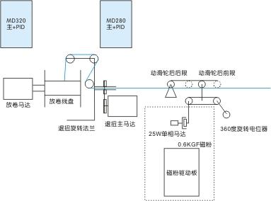 采用普通異步電機+減速機+磁粉離合器+磁粉張力控制器;
