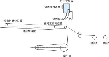 1)如附圖一所示意:25W小功率馬達帶動磁粉的輸入端,磁粉的輸出端連接到儲線架動滑輪,馬達+磁粉的作用總是使得動滑輪有運動到前限的趨勢,由于磁粉特性,因此可以堵轉;