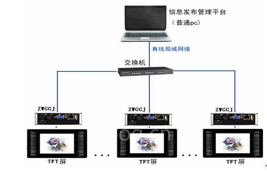 本系統(tǒng)結(jié)構(gòu)簡單、直觀。如:在公司內(nèi)可以將終端盒掛接到公司內(nèi)網(wǎng),每個終端控制一個屏幕,在公司網(wǎng)的任一臺普通PC安裝我們的管理軟件,即可對網(wǎng)內(nèi)的所有ZWGGJ終端進行信息的發(fā)布,管理。