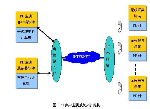 圖中的PH計放置在每個需要監(jiān)測的監(jiān)測點,每個PH計通過串口連接一個無線采集終端,采集終端通過GPRS無線上網(wǎng),將數(shù)據(jù)通過INTERNET互聯(lián)網(wǎng)傳輸?shù)焦芾碇行摹?BR> 管理中心的計算機通過ADSL、撥號、寬帶等方式連接到互聯(lián)網(wǎng),接收終端傳輸過來的PH數(shù)據(jù)。多個采集終端使用一個管理中心,數(shù)據(jù)統(tǒng)一傳輸?shù)焦芾碇行?。在管理中心可以設置分管理中心,分管理中心也可以接收終端的數(shù)據(jù),但是權限不一樣,管理中心可以接收所有終端的數(shù)據(jù),而分管理中心只能接收自己有權限管理的終端的數(shù)據(jù)。