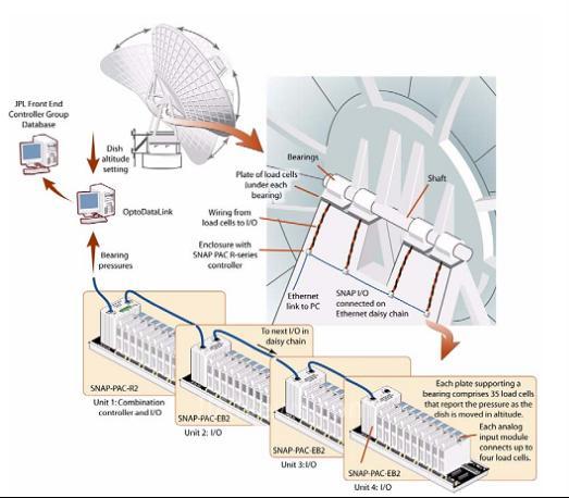 Edwards及其他Opto 22工程師一起為JPL提供了售前咨詢,并幫助DSN天線項目制定了要求。他們一同計劃了項目使用長距離纜線(約300英尺),4個載荷板/軸承位置設(shè)置分布式I/O。Edwards認為SNAP-PAC-EB2處理器能夠為JPL提供菊花鏈狀的分布式I/O,集中所有載荷元件讀數(shù)返回給一個智能控制器,如Opto 22 SNAP-PAC-R2可編程自動化控制器,提供多重連接用于SNAP PAC系統(tǒng)及SQL數(shù)據(jù)庫的數(shù)據(jù)交互。