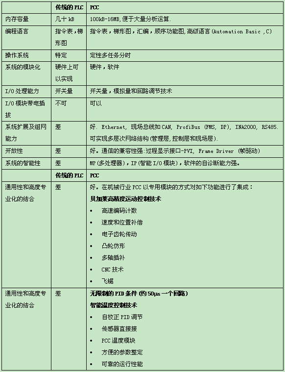 通過以上的討論,我們對PCC的特點有一個較為全面的了解,在此不妨將其與傳統(tǒng)的PLC以表格的形式作一下比較.