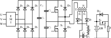 此電路中,EMI濾波器主要用于抑制交流電網(wǎng)與直流變換電路之間的高頻噪聲干擾。D1~D6構成三相橋式不可控整流電路,將380V交流電轉換為直流電,C0作濾波用,C1、C2、S1、S2、D01、D02構成半橋式DC/AC變換器,將直流電壓逆變?yōu)楦哳l交流方波電壓,并經(jīng)高頻變壓器T送出。D7、D8、L、C3構成變壓器次級整流濾波環(huán)節(jié)。GB為蓄電池,S3為控制蓄電池放電的開關管,R為放電電阻。充電電壓V0與開關管S1、S2工作的占空比及變壓器次初級線圈匝數(shù)比成正比,即[2]V0=·VC0(1)