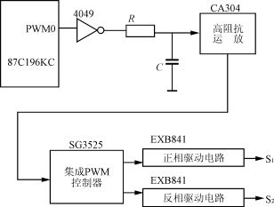 采用87C196KC型單片機,有兩種方法可以實現(xiàn)PWM控制信號的輸出:其一是通過PWM信號輸出口。此時,信號的最高開關頻率為31.25kHz(16M晶振),這樣開關電源實際能達到的開關頻率為15.625kHz。然而,高頻開關充電電源的開關頻率在20kHz以上,所以這種方法雖然軟件開銷小,卻不能滿足高頻開關電源對開關頻率的要求。另一種方法是采用高速輸出口HSO實現(xiàn)。HSO輸出的PWM信號頻率可調,但控制精度較低,而且軟件開銷很大。由上可知,87C196KC輸出的PWM信號都不適宜直接作為高頻開關充電電源的逆變控制信號,因此,本方案采用專用的集成PWM控制器SG3525產(chǎn)生PWM脈沖。其實現(xiàn)原理如圖3所示。
