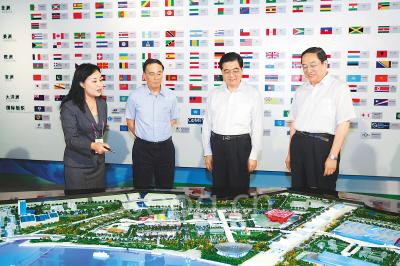 在上海世博會(huì)籌備工作概況展區(qū),反映上海世博會(huì)空前規(guī)模的園區(qū)規(guī)劃沙盤,引領(lǐng)觀眾漫游世博會(huì)園區(qū)的三維動(dòng)畫短片,張貼各參展方國(guó)旗和會(huì)旗的展示墻,反映全國(guó)人民支持參與籌辦上海世博會(huì)情況的展板,表現(xiàn)富于創(chuàng)意的60個(gè)展館的模型,展現(xiàn)被稱為“東方之冠”的中國(guó)館建筑細(xì)節(jié)的視頻,吸引了胡錦濤等領(lǐng)導(dǎo)同志的目光,他們一次次停下腳步,看得十分專注,對(duì)上海世博會(huì)籌辦工作取得的成績(jī)給予充分肯定,對(duì)各參展方的熱情參與表示高度贊賞。
