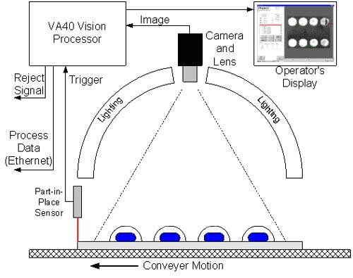 圖1: 使用我們總的視覺任務(wù)條款: (1.) 定位:藥板的位置是通過傳感器感應(yīng)到的,一旦藥板的位置被知道.藥片的位置也就被知道 (2.) 識別 在這個(gè)例子里包括藥片的有或沒有,尋找藥板的外形和藥片的顏色,確保正確的產(chǎn)品被包裝。你還可以讀取藥板的生產(chǎn)日期. (3.) 檢測 確保藥片在泡罩里, 檢測藥片是否是半?;蛘唠s質(zhì)等.