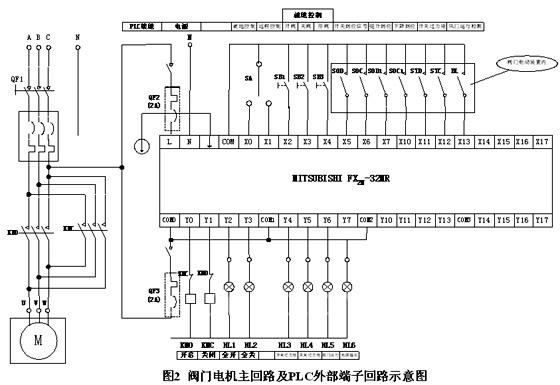 圖2為閥門電機主回路及PLC外部端子回路示意圖。三相交流電動機M分別由交流接觸器KMO和KMC的通斷來驅(qū)動閥芯順、逆時針轉(zhuǎn)動實現(xiàn)閥門的開啟或關(guān)閉。