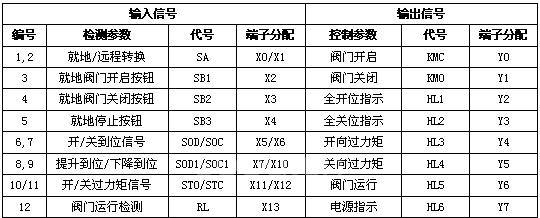 系統(tǒng)選用三菱電機公司生產(chǎn)的FX2N-32MR作為RTU單元。智能驅(qū)動裝置是引進美國Limitorque技術(shù)的SMC多回轉(zhuǎn)型閥門電動裝置,它可以單臺控制,也可集中控制,可現(xiàn)場操作,也可遠程控制,除能驅(qū)動閥門動作外同時還能將自身的狀態(tài)以標準信號的方式送出供PLC進行狀態(tài)檢測[2]??紤]閥門站兼有就地和遠程兩種控制方式,PLC共管理12路輸入信號和8路輸出信號。其輸入輸出信號及端子分配如表1所示。