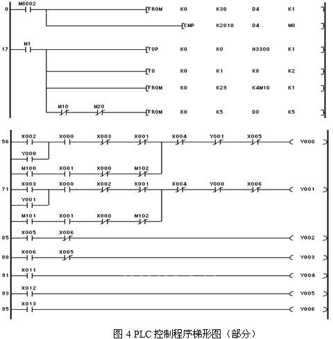 PLC端閥門站實時測控軟件控制過程流程圖如圖3所示。它采用梯形圖邏輯編制,編程方便且直觀。因篇幅原因,下面給出PLC本體從FX2N-4AD給取AD轉(zhuǎn)換結(jié)果及部分控制程序梯形圖[1,4],如圖4所示。