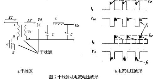 如圖2b所示,I1是變壓器初級線圈電流,I2是二次線圈電流,VDS是開關(guān)管漏源極間電壓,VD是二次側(cè)輸出二極管上兩端電壓。開關(guān)管關(guān)斷時(shí)產(chǎn)生頻率為f1的干擾,而輸出二極管反向電流引起頻率為f2的干擾。