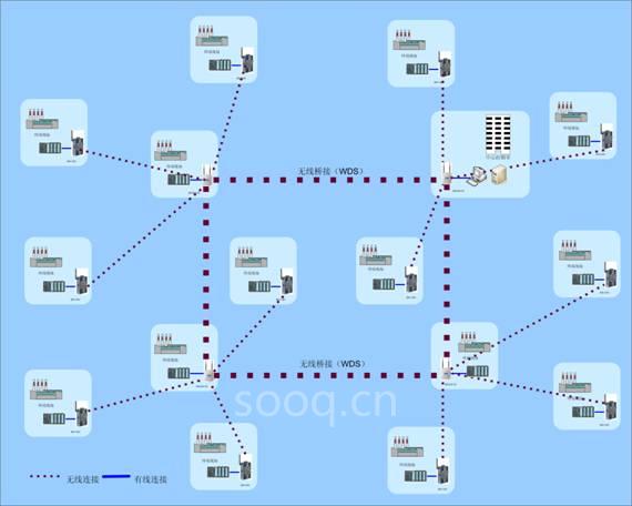本方案主要采用研華無線AP EKI-6311G與無線串口服務(wù)器EKI-1351兩種設(shè)備。由于現(xiàn)場有100個(gè)PLC設(shè)備,且每臺(tái)PLC均需要采用無線方式傳輸至上位機(jī)。由于現(xiàn)場PLC與中控室距離較遠(yuǎn),且無線節(jié)點(diǎn)較多,為保障無線網(wǎng)絡(luò)傳輸?shù)目煽?,因此我們推薦每10臺(tái)PLC透過1臺(tái)無線AP連接,即總共需10臺(tái)無線AP。無線AP間采用WDS (Wireless Distribution System無線分布式系統(tǒng)) 技術(shù),讓無線網(wǎng)絡(luò)的多臺(tái)無線AP設(shè)備靈活的橋接,方便的把100臺(tái)PLC的數(shù)據(jù)透過100個(gè)EKI-1351傳輸至無線AP,最終再上傳至中控室的上位機(jī)。