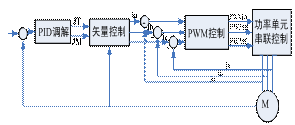 RHVC系列高壓變頻器采用轉(zhuǎn)子帶速度反饋的矢量控制技術(shù)。控制系統(tǒng)采用速度環(huán)和電流環(huán)雙閉環(huán)結(jié)構(gòu),速度環(huán)采用PID調(diào)節(jié)器,能有效地限制動態(tài)響應的超調(diào)量,加快響應速度。在轉(zhuǎn)子磁場定位坐標下電機定子電流分解成勵磁電流與轉(zhuǎn)矩電流。維持勵磁電流不變,控制轉(zhuǎn)矩電流也就控制電機轉(zhuǎn)矩。實際運行中給定轉(zhuǎn)速與實際轉(zhuǎn)速的差值通過PID調(diào)節(jié)生成轉(zhuǎn)矩電流IT。經(jīng)過矢量變換將IT、IM變換為電機三相給定電流Ia*、Ib*、Ic*,它們與電機運行電流相比較生成三相驅(qū)動信號。系統(tǒng)全數(shù)字式的關(guān)鍵是電流環(huán)數(shù)字化,就是把數(shù)?;旌鲜阶冾l系統(tǒng)中的模擬電流環(huán),采用數(shù)字方式加以實現(xiàn),其核心提高電流環(huán)的處理速度,達到或接近模擬電流環(huán)的響應速度。根據(jù)目前的微處理器DSP、A/D器件的水平,可以滿足硬件的需要;另一方面在于控制策略及控制軟件的優(yōu)化。良好的系統(tǒng)硬件和軟件設計是使研制的系統(tǒng)達到實用化的保證,在滿足性能要求的基礎(chǔ)上,必須充分利用硬件資源,提高集成度降低硬件成本,達到產(chǎn)品化的目標。整個系統(tǒng)的控制原理框圖如圖2所示。