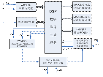 系統(tǒng)由DSP數(shù)字信號處理器作為主控CPU,可編程邏輯器件實現(xiàn)部分算法的計算和波形發(fā)生及各種信號的處理,單元的狀態(tài)信息經(jīng)可編程邏輯器件進行串行編碼后通過光纖發(fā)送到主控制器的接收板,主控制器接收板進行串行到并行解碼后傳輸?shù)街骺谻PU;主控CPU根據(jù)單元狀態(tài)信息,調(diào)整系統(tǒng)的控制狀態(tài);測速方式采用變M/T測速,可以實現(xiàn)高精度的測速要求。本系統(tǒng)中的電流檢測元件選擇了根據(jù)磁場補償原理制成的霍爾效應電流互感器,以滿足實時監(jiān)測電流的要求。整個硬件的原理框圖如圖3所示。