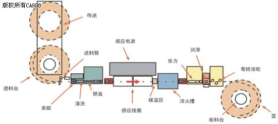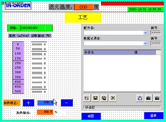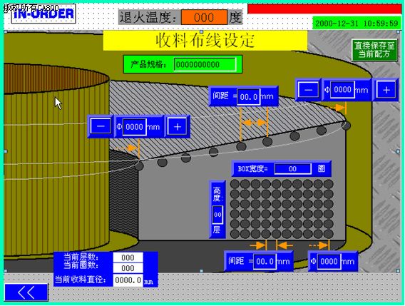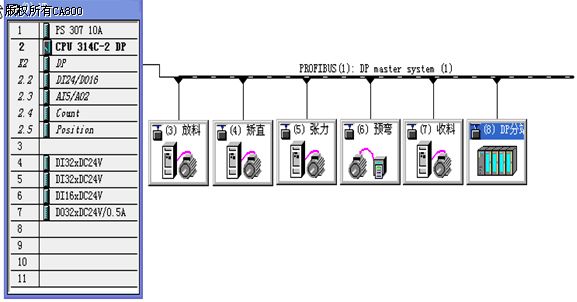 摘要:本文介紹了S7-300PLC通過PROFIBUS-DP通訊方式控制MM440變頻器,配合人機(jī)界面,結(jié)合工藝要求,實現(xiàn)了鋁管在線退火的完美控制。 關(guān)鍵詞:S7-300PLC MM440變頻器 PROFIBUS-DP通訊 一、項目介紹 1.簡介 蘇州奧智機(jī)電設(shè)備有限公司一直致力于空調(diào)用銅、鋁管加工設(shè)備的研發(fā)、設(shè)計、制造及服務(wù),為用戶提供高性價比的卓越產(chǎn)品。其研制的在線退火設(shè)備是近年來開始在銅、鋁管加工行業(yè)中大量應(yīng)用的設(shè)備,與傳統(tǒng)的輥底爐相比,占地面積僅為四分之一,而且節(jié)省工序,省卻了傳統(tǒng)的在退火前纏繞的工序,降低了管材消耗和在工序過程中的擦傷。管材的成品率高,數(shù)千米長的盤管上廢管只有1-2米,產(chǎn)生在整盤管材的開頭部分,能實現(xiàn)盤到盤的加工流程,極大地提高了生產(chǎn)效率。 該設(shè)備采用S7-300PLC結(jié)合人機(jī)界面通過PROFIBUS-DP通訊協(xié)議實現(xiàn)對MM4變頻器的速度控制,整個電控系統(tǒng)體系簡明,布線簡單可靠,控制運行準(zhǔn)確平穩(wěn),收到了良好的效果。 2.簡要工藝介紹 在線退火設(shè)備用于將料籃裝載的硬態(tài)管通過在線感應(yīng)加熱方式退火成軟態(tài)管。在連續(xù)運行過程中,將置于保護(hù)氣體氛圍中的管材通過中頻感應(yīng)加熱,使其溫度達(dá)到480度左右,再通過保溫區(qū)(確保在一定的溫度下有時間在加熱后進(jìn)行全晶粒的勻化并消除管子表面的褪色),進(jìn)入到快速冷卻區(qū)(即將冷卻水直接噴淋到加熱后的管材上使其快速冷卻),將附著在管材表面的水通過吹干裝置吹干后進(jìn)入到履帶式自動張力裝置,使管材在行進(jìn)的過程中一直保持一個合適的張力,然后經(jīng)過抺油處理后進(jìn)入到收料籃中。 外觀示意圖如下: 1. 系統(tǒng)硬件 1) PLC 2) HMI 3) 變頻器 此項目中放料和收料都由交流變頻電機(jī)通過減速箱驅(qū)動料籃高速旋轉(zhuǎn),屬于大慣量系統(tǒng),而且要求很高的起動轉(zhuǎn)矩;通過采用MM440的無速度傳感器矢量控制方式,可以獲得接近閉環(huán)控制的性能,速度精度可達(dá)0.2-0.5%,同時省去了速度傳感器,具有較低的維護(hù)成本。與傳統(tǒng)V/Hz控制比較,無速度傳感器矢量控制可以獲得改進(jìn)的低速運行特性,變負(fù)載下的速度調(diào)節(jié)能力亦得到改善,同時還可獲得高的起動轉(zhuǎn)矩,這在高摩擦與慣性負(fù)載的起動中有明顯的優(yōu)勢。正是由于這些驅(qū)動特性,此項目選擇了MM440變頻器。 2.控制系統(tǒng)主要器件 電源模塊 6SE7 307-1KA00-0AA0 2塊 3.系統(tǒng)配置 根據(jù)以上的選型,組成了如下的控制結(jié)構(gòu)圖: 三、控制系統(tǒng) 按照下面的設(shè)備布置圖,簡要闡述系統(tǒng)的控制過程