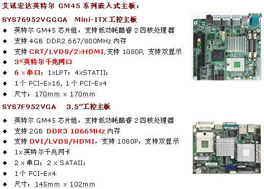 GM45是當(dāng)前英特爾應(yīng)用于工控領(lǐng)域性能最強(qiáng)的嵌入式芯片組,艾訊宏達(dá)契合英特爾產(chǎn)品發(fā)展趨勢,推出GM45系列嵌入式主板(SYS76952VGGGA & SYS7F952VGA),性價比極具優(yōu)勢。GM45的低功耗、高清顯示、超強(qiáng)視頻處理能力的特性使其在網(wǎng)絡(luò)數(shù)字媒體播放、智能樓宇、醫(yī)療成像等高端行業(yè)極具優(yōu)勢。